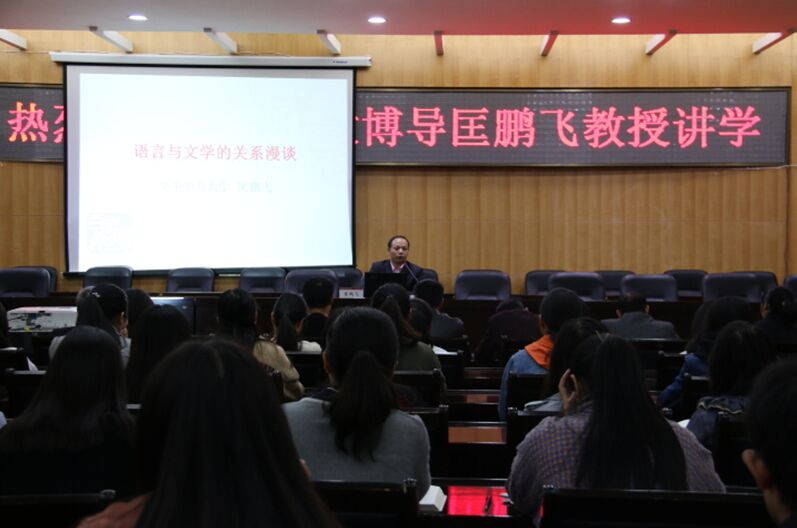 本网讯(通讯员 高舒 张真洁 图/文)10月19日上午,华中师范大学博士生导师匡鹏飞教授应邀为我校文史学院师生作了题为《语言与文学的关系漫谈》的学术报告。学术报告会在科技楼三楼报告厅举行,文史学院党委书记张祥、院长刘畅教授、校长办公室副主任王春阳教授、科研处副处长龚世学教授,汉语教研室、汉语国际教育教研室全体教师、2017级汉语言文学专业部分学生及“国培计划”2018小学语文项目培训学员共200多人参加了报告会。报告会由校科研处副处长龚世学教授主持。