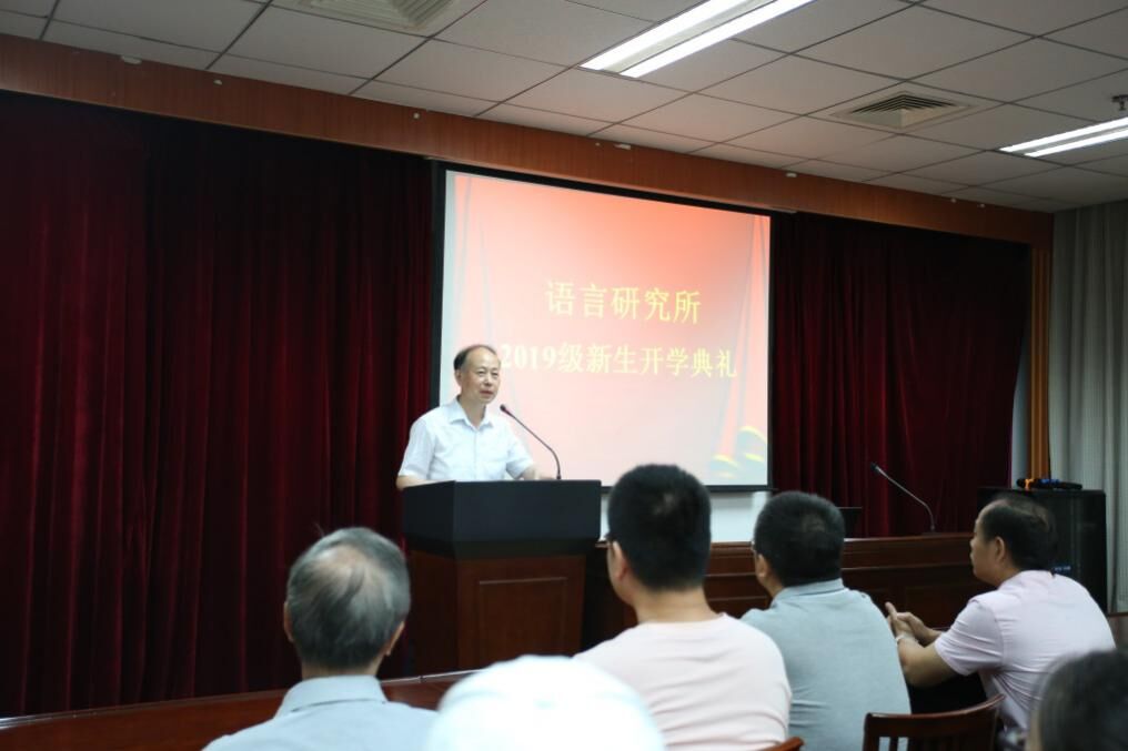 在同学们的掌声中,开学典礼正式开始。首先,中心主任汪国胜教授对2019级新生的到来表示热烈欢迎,他向大家一一介绍了中心的各位老师、中心今年的招生情况、中心的人才培养、科学研究、学术活动等基本概况。接着,汪主任向新生们重点强调了研究生期间的学习任务和时间安排,针对不同类型、不同学历层次的研究生提出了不同的要求:学术型硕士和博士要着力提高自己的科研能力,应用型硕士要培养自己的专业实践能力等。最后,汪主任用邢先生的两句话来鼓励大家珍惜来之不易的学习机会,一要谨记所训“抬头是山,路在脚下”,要有远大的志向和脚踏实地的精神;二是“为人第一、为学第二”,研究生期间要不忘培养良好的人格品质,学会做人做事。汪主任还对新生们给予了亲切的关怀,交代大家在学习和生活中遇到任何困难都可以找语言所的任何一位老师寻求帮助。