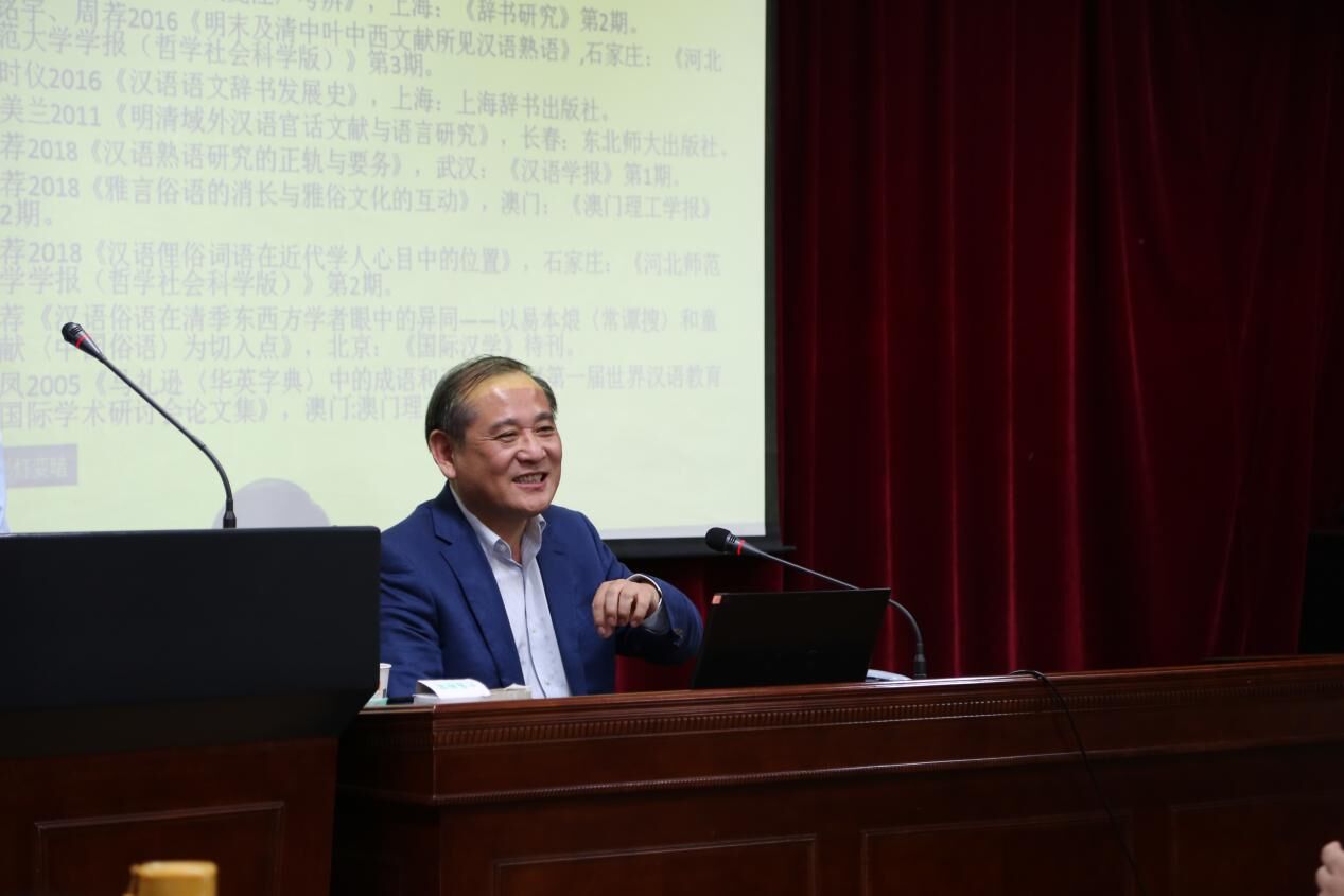 2019年11月3日下午,澳门理工学院澳门语言文化研究中心执行主任周荐教授应邀到本中心讲学,在学术报告厅做了一场题为《明恩溥〈汉语谚语熟语集〉的语料价值和熟语理念》的讲座。讲座由中心副主任匡鹏飞教授主持,中心部分研究人员及博士、硕士生聆听了讲座。