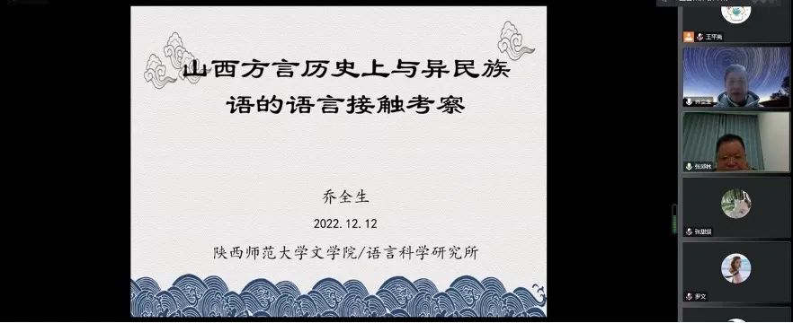 2022年12月12日晚,陕西师范大学乔全生教授应教育部第三批“全国党建工作样板支部”培育创建单位华中师范大学文学院语言学教工党支部邀请,做了题为《山西方言历史上与异民族语的语言接触考察》的学术讲座。根据防疫要求,讲座采用线上方式举行,党支部书记张邱林教授主持,文学院、语言所的数十名师生参加了此次学术讲座。