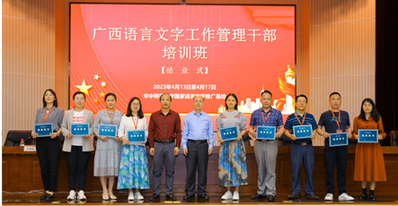 结业式由华中师范大学语言研究所副所长、教育部人文社会科学重点研究基地语言与语言教育研究中心副主任匡鹏飞教授主持。结业式上安排了培训剪影视频、分组汇报培训心得、颁发结业证书等环节,最后由汪国胜教授做总结。汪教授在总结中指出,本次培训内容既有宏观的国家语言文字事业的地位和作用的阐释,也有微观的语言文字问题的讲解和分析;目的是让学员深刻认识新时代语言文字工作的重要意义,明确目标任务,增强责任感、使命感和紧迫感,提高语言文字工作管理能力;希望学员在培训以后继续加强联系,相互沟通,交流工作经验,分享工作成果,共同推进广西的语言文字事业。