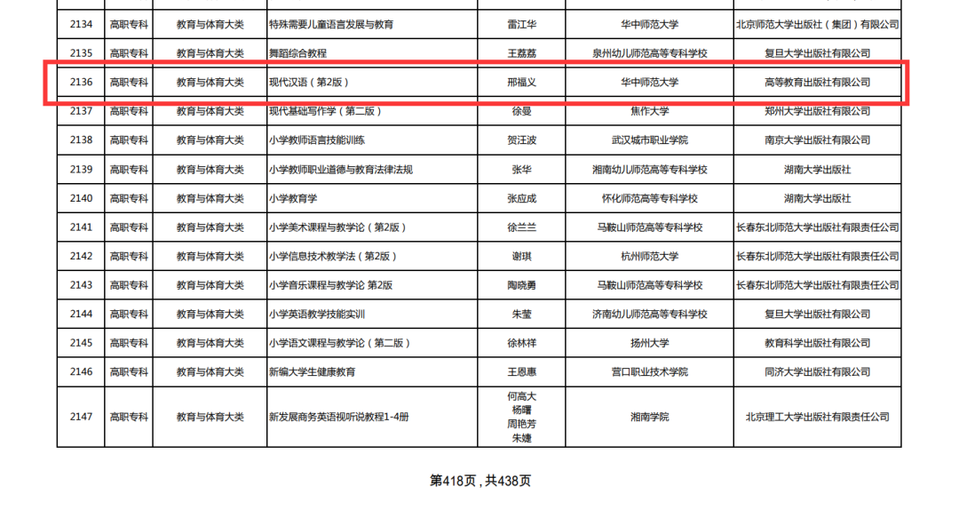 日前,教育部办公厅发布了《教育部办公厅关于公布首批“十四五”职业教育国家规划教材书目的通知》,经有关单位申报、形式审查、专家评审、专项审核、专家复核、面向社会公示等程序,共确定7251种教材入选首批“十四五”职业教育国家规划教材。由高等教育出版社出版、本中心名誉主任、著名语言学家邢福义先生和中心主任汪国胜教授主编的《现代汉语(第2版)》,经我校培训中心申报、教育部遴选,入选首批“十四五”职业教育国家规划教材书目(“十三五”复核教材)高职专科教育与体育大类。