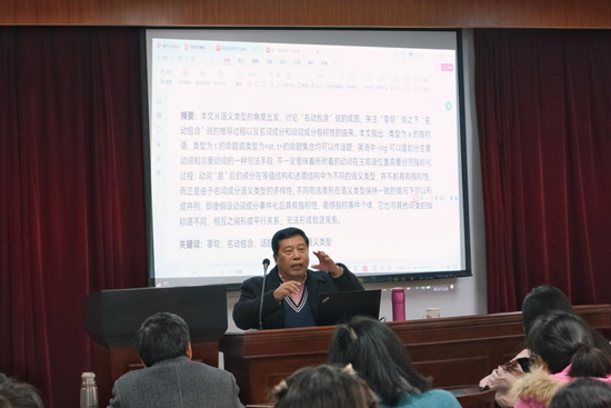 “名动包含”是沈家煊先生提出的一种观点,认为动词包含于名词,都是指称语。沈先生具体从动词可以做话题、可以充当主宾语、可以做“是”的宾语、可以跟名词并列等4个方面论证了动词的指称性,应类属于名词。潘教授则认为,沈先生论证“名动包含”的4条理据都不可靠,因此建立在4条论据基础上的“名动包含”说是不能成立的。潘教授的报告思路清楚,论证严密,加深了大家对名动关系的认识。汪主任在总结时指出,潘教授的报告富有启发性,活跃了大家的思想。感谢潘教授给我们带来了新的学术信息。