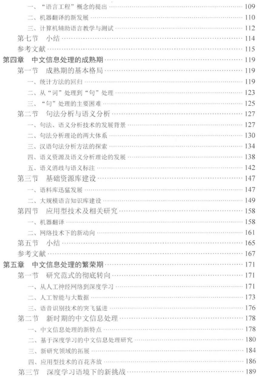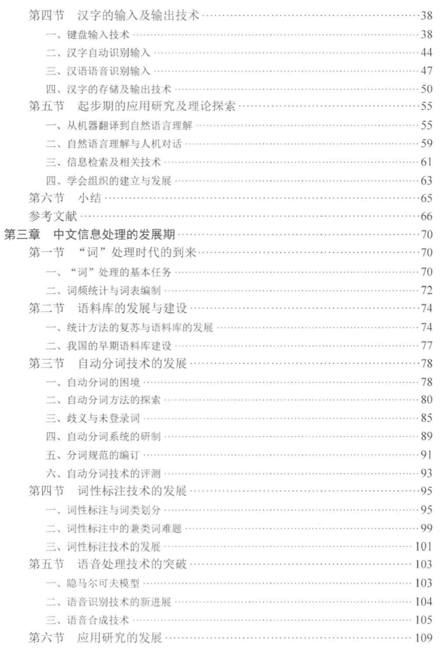 《中文信息处理发展简史》以中文信息处理的学科发展脉络为线索,介绍了中文信息处理在不同历史时期的发展情况与主要成果。该书首先简要介绍了中文信息处理学科的基本概况,然后以起步期、发展期、成熟期、繁荣期等不同的历史阶段,分章对中文信息处理各个历史阶段的发展过程和成果进行了具体阐述。该书以时间为轴,贯穿起中文信息处理研究所涉及的各方面问题,同时也将中文信息处理这一学科从无到有、从小到大、从弱到强的发展过程呈现出来。