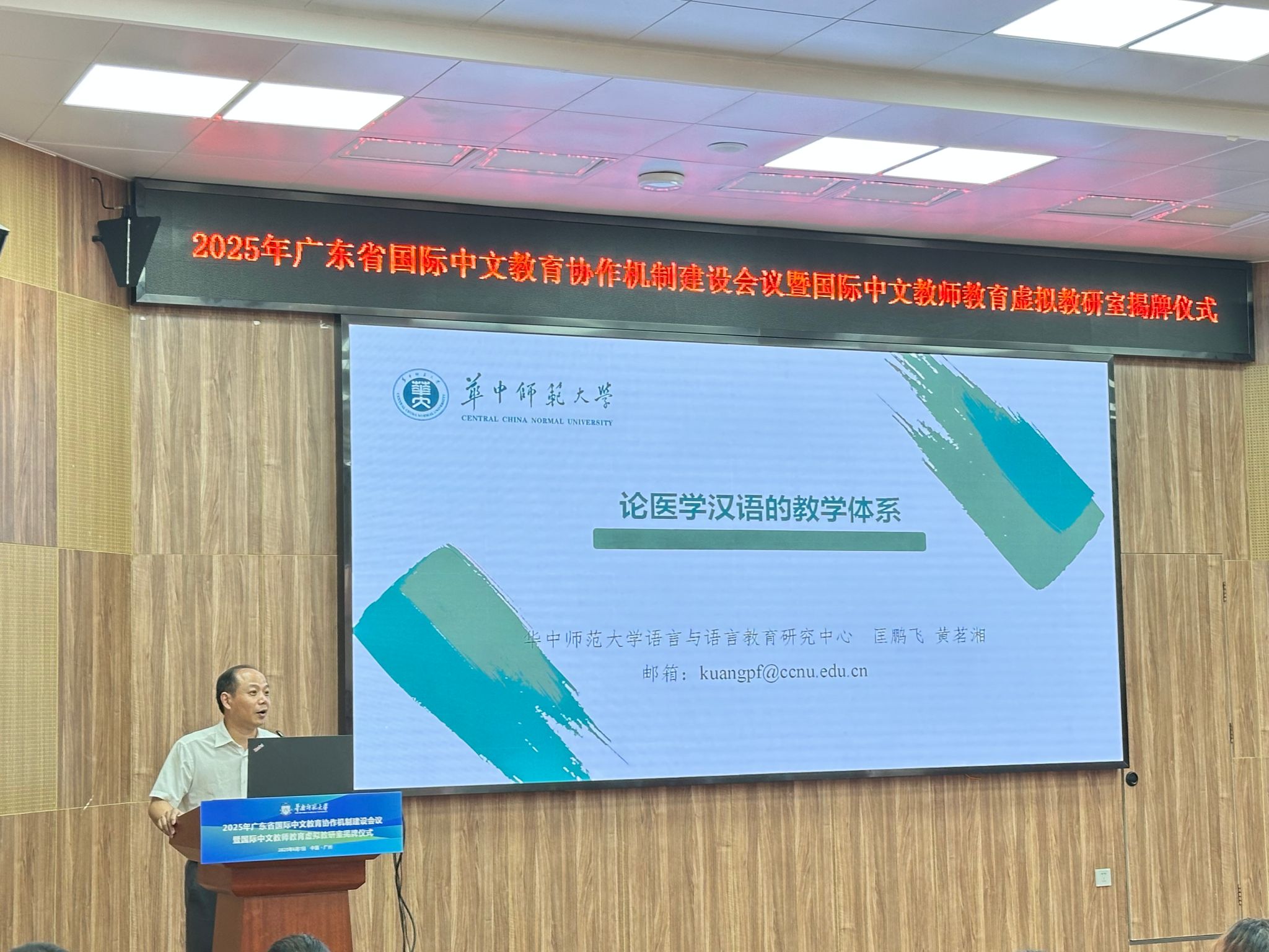 6月7日,匡鹏飞教授出席了该校国际文化学院主办的“2025年广东省国际中文教育协作机制建设会议暨国际中文教师教育虚拟教研室揭牌仪式”。上午在全体会议上做了题为《论医学汉语的教学体系》的主旨报告;下午在分论坛(一)“国际中文教育博士点建设专家论坛、期刊主编与青年学者对话论坛”上,分别就国际中文教育专业博士点建设问题以及《汉语学报》的刊物特色、栏目设置、审稿流程等情况进行了发言。