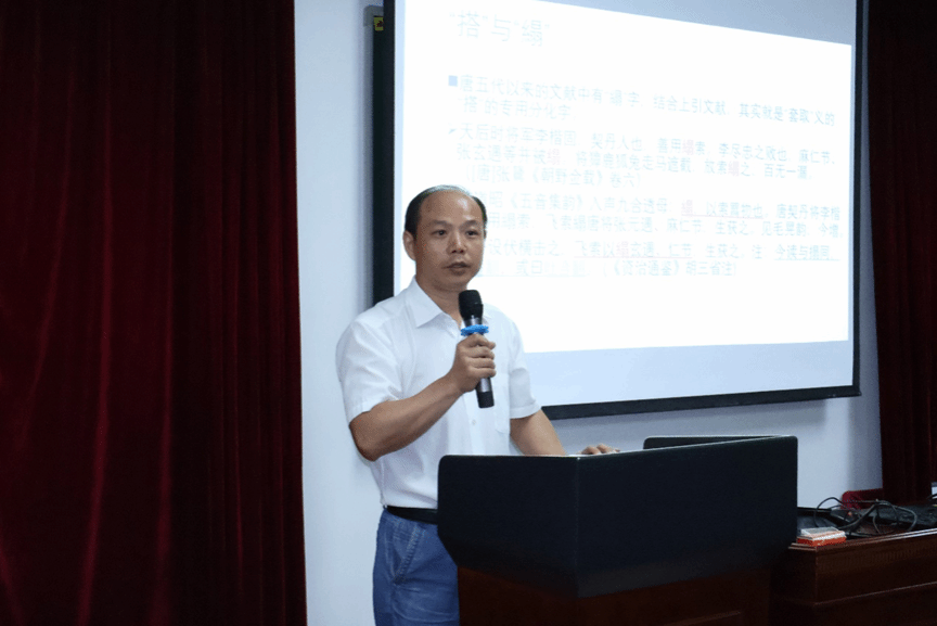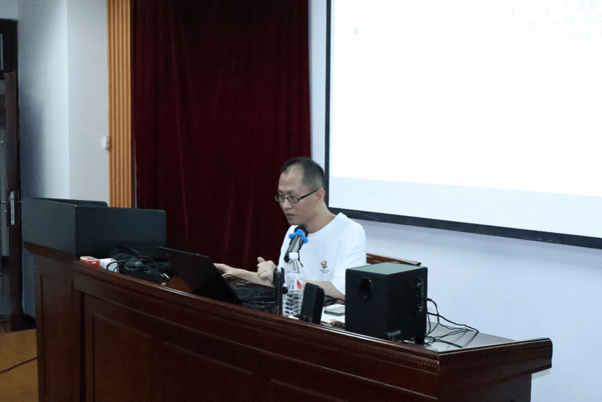 池明明老师报告的论文是《说“搭”》。他从现代汉语方言中“搭”“答”对立的现象出发,结合历史文献,认为“搭”的本字是盍韵端母的“𠞈”字,本义为“著(着)”,并指出“搭”的今义都是由“附着”义发展而来。报告结束后,中心青年教师王平夷和博士生黄纪潘分别就本字考证与池明明老师进行了互动,博士生何枫清提供了雷州闽语的证据。匡鹏飞教授进行了点评,认为论文有3个特色:问题清楚、方法科学、论证严密,并建议参考前辈学者关于本义和核心义的观点增加论文的理论色彩。