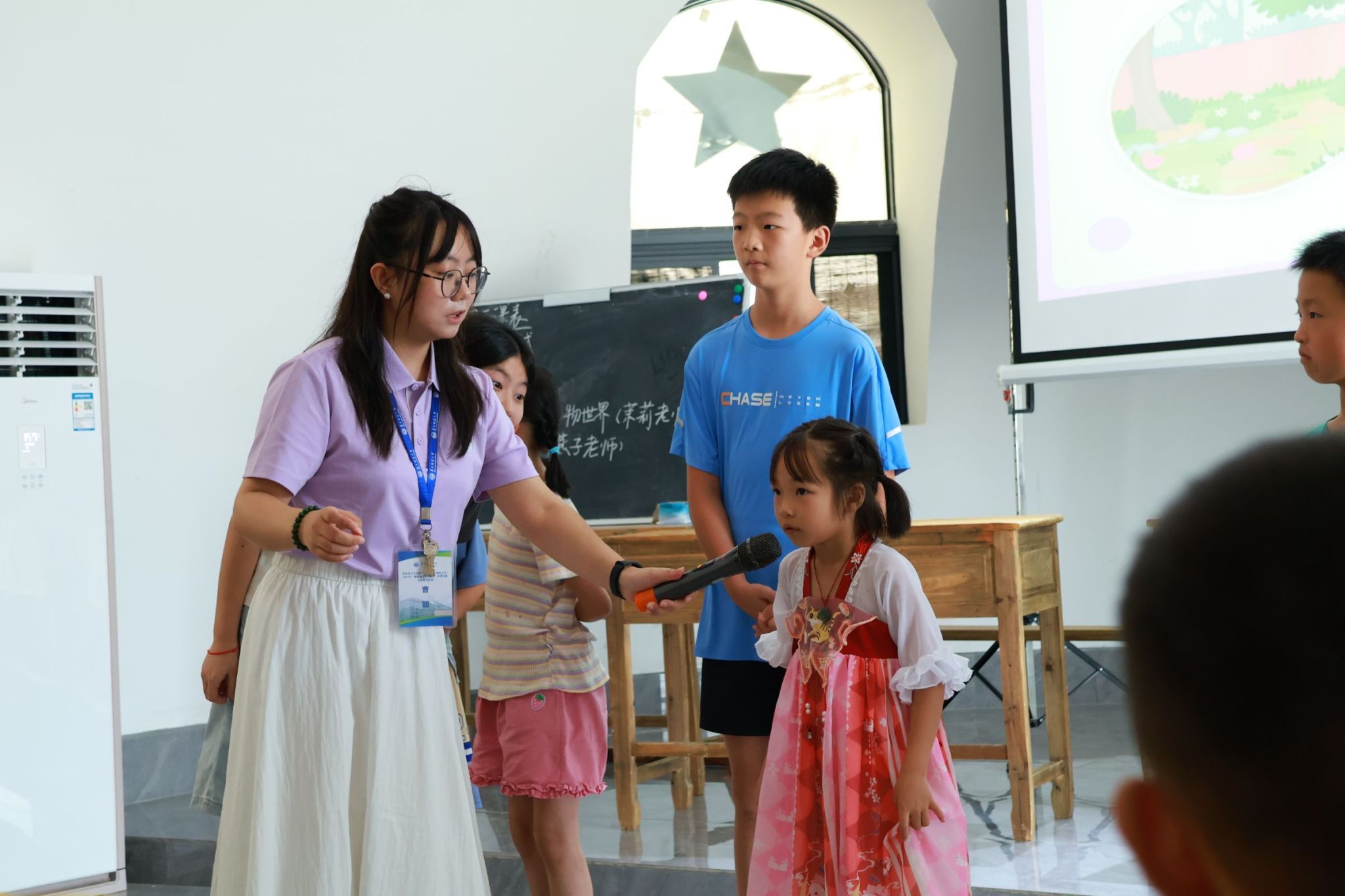 申定羽以茶陵风光切入,通过实践团队过往经历介绍了“推普助力乡村振兴”活动的意义、实践队的组成情况以及课程安排,寄语实践队队员要传承茶陵红色革命精神,全心投入活动,期望小朋友们能够通过语言文字、自然科普、唱歌跳舞、安全健康和手工技能等系列素质课程获得提升。