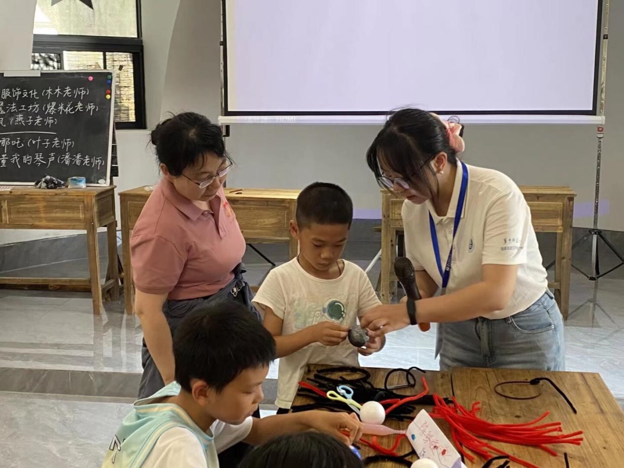 为激发孩子们的学习兴趣,实践队设计了多元素质课程,课程涵盖四大模块。安全教育课“我是小小安全员”“创造我们的历险记”聚焦假期出行安全与青少年心理健康。表演活动课“《小哪吒》手势舞”“甲骨文健身操”“扇韵武风”融合中国传统文化,学生们在“开、合、提、沉”的动作间,感受中华文化的刚柔并济、博大精深。语言艺术课“说唱《中国话》”“绕口令大闯关”“把生活拼成诗”寓教于乐,融学于趣,展现语言艺术魅力。手工创意课“不织布魔法工厂”“捏出奇妙动物世界”“诗歌中的服饰文化”,以及自然科普课“神奇的紫甘蓝”趣味科学实验培养学生自主动手能力与科学精神。