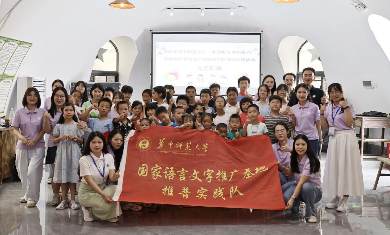 2025年7月22日至27日,国家语言文字推广基地(华中师范大学)推普实践队走进湖南省茶陵县湾里红军村,开展了为期六天的“推普助力乡村振兴”暑期社会实践活动。本次实践活动由我校教师教育学院申定羽副教授和语言研究所王毅老师带队,语言研究所13名研究生参与。实践队以“教学+调研”双线并行的模式,将知识课堂与乡村实践相结合,为当地孩子带去了一场别开生面的语言文化体验。实践队入选了由教育部语用司、共青团中央组织的“推普助力乡村振兴”全国大学生暑期社会实践志愿服务活动重点团队,旨在深入贯彻国家语言文字工作方针,加大国家通用语言文字推广力度,助力乡村教育振兴和文化繁荣,引导青年学子在服务基层中锤炼本领,为推进教育现代化和乡村文化振兴贡献青春力量。