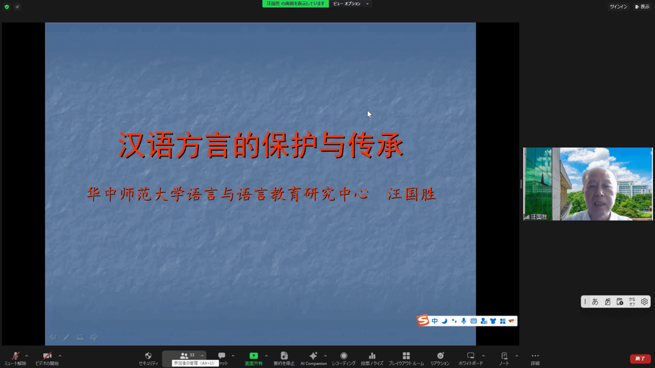 2025年7月19日,本中心名誉主任汪国胜教授应邀在日本大东文化大学研究生院中国语言文化学专业和外国语学部中文系联合主办的第29届国际研讨会上做学术讲演。讲演线上进行,讲题为“汉语方言的保护与传承”,内容包括4个方面:方言的地位;方言的保护;方言的传承;方言的未来。汪教授指出:改革开放以来,随着普通话的推广普及,城镇化进程的加快,方言发生了显著的变化,有的弱势方言处于消亡的境地。为了保护语言的多样性和文化的多元性,亟待对方言进行科学的保护。传承是方言保护的最好方式。提倡和鼓励学生在学好普通话的同时,也要学好方言,成为方言的守护者和传承人。从未来趋势看,方言会逐渐向普通话靠拢,增强一致性,缩小差异性,但有的弱势方言会日趋衰微,走向消亡。会议旨在促进东西文化的融合,提升面向世界的中国语言文化学领域的研究与教育质量。应邀做讲演的学者还有中国北京语言大学的李宇明教授和日本东洋大学的王亚新教授。