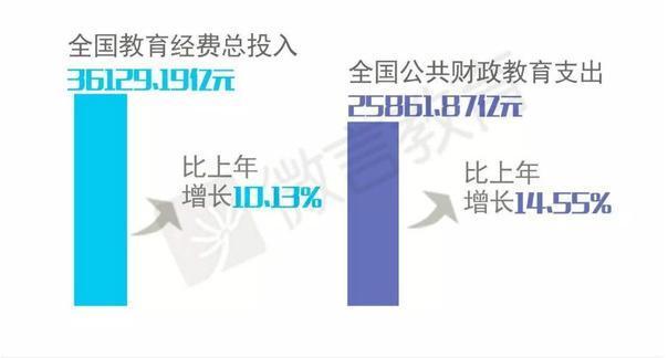 2015年,全国教育经费总投入为36129.19亿元,比上年的32806.46亿元增长10.13%。其中,国家财政性教育经费(主要包括公共财政预算安排的教育经费,政府性基金预算安排的教育经费,企业办学中的企业拨款,校办产业和社会服务收入用于教育的经费等)为29221.45亿元,比上年的26420.58亿元增长10.60%。