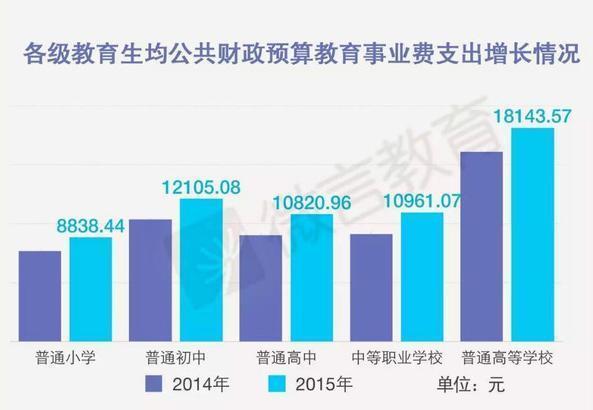 2.各级教育生均公共财政预算教育事业费支出增长情况。2015年全国普通小学、普通初中、普通高中、中等职业学校、普通高等学校生均公共财政预算教育事业费支出情况是: