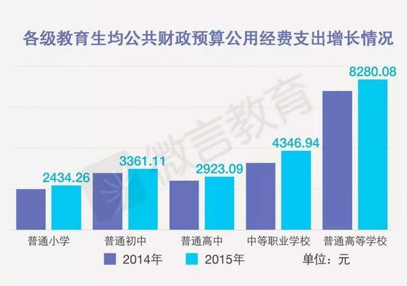 3.各级教育生均公共财政预算公用经费支出增长情况。2015年全国普通小学、普通初中、普通高中、中等职业学校、普通高等学校生均公共财政预算公用经费支出情况是: