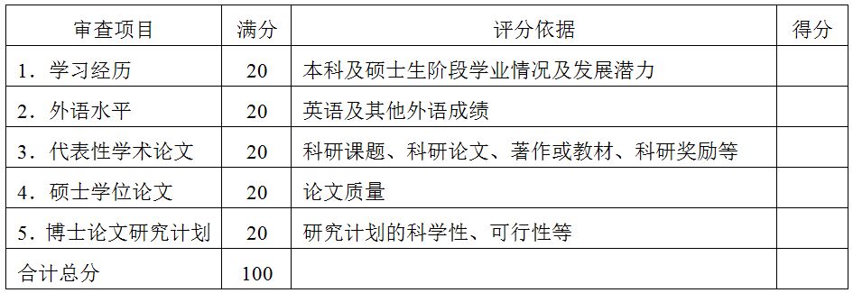 综合考核的内容包括专业基础、科研能力、综合素养、外语水平等方面。综合考核的方式包括笔试、面试和评议。具体要求及评分见下表: