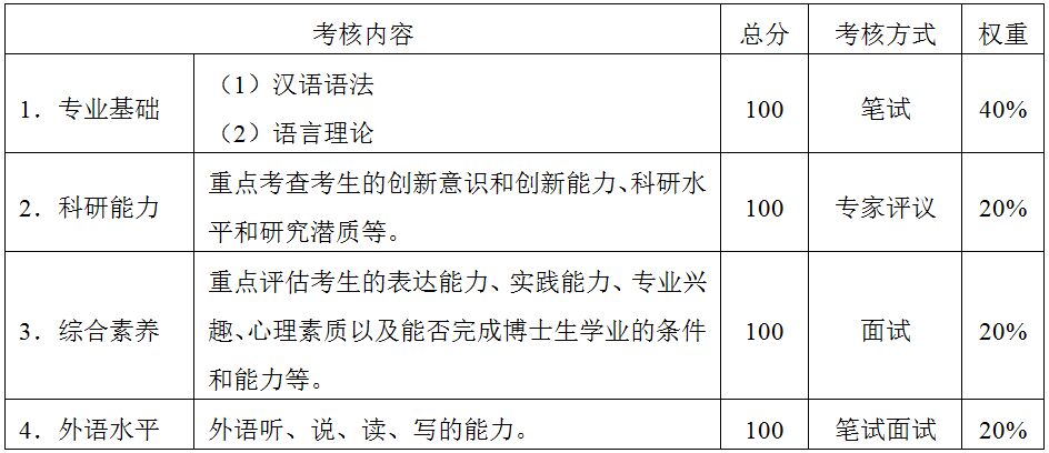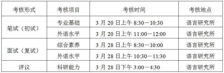 综合考核分两个阶段:第一阶段为专业基础和外语水平的笔试;第二阶段为综合素养和外语水平的面试、科研能力的评议。第一阶段考核(初试、笔试)结束后,将根据语言所的招生计划,按照1:2的比例,确定并公布进入第二阶段考核(复试、面试)的考生名单。具体时间安排: