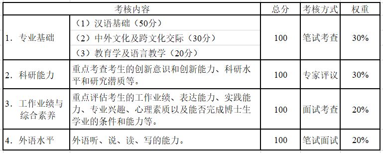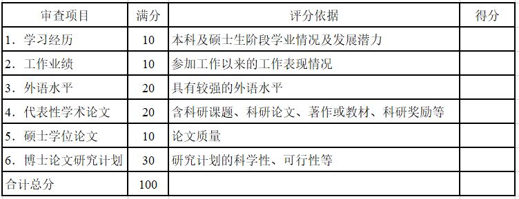 综合考核的内容包括专业基础、科研能力、工作业绩与综合素养、外语水平等方面。综合考核的方式包括笔试和面试。具体要求及评分见下表: