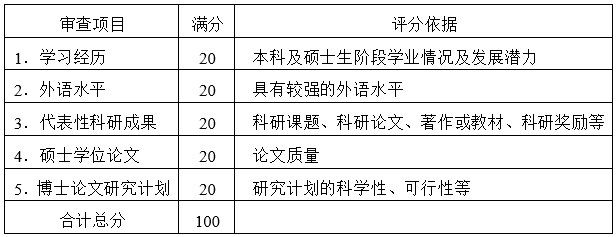 材料评审总分值为100分。材料评审小组根据申请人提供的材料,对其学术背景、学业成绩、外语水平、科研成果、获奖、同行专家推荐意见、毕业论文或开题报告、读博期间研究计划等材料进行量化并作出综合评价,确定最终入围综合考核的考生名单并对外公示。材料评审具体内容: