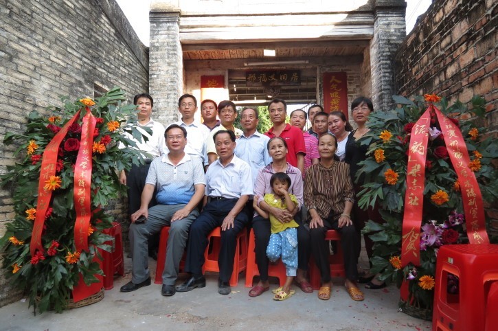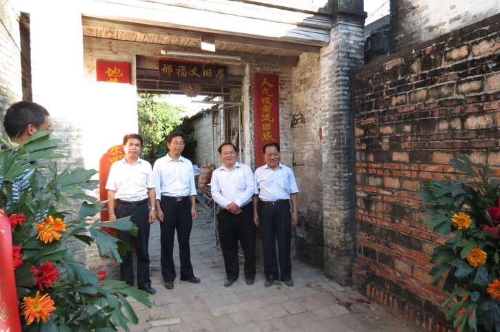 海南邢氏教育基金常务副理事长邢尧先生(右二)、乐东邢氏代表邢明通先生(右一)、黄流中学校长邢文雄先生(左二)和我代表《流韵》为邢福义旧居揭牌。(揭牌前)