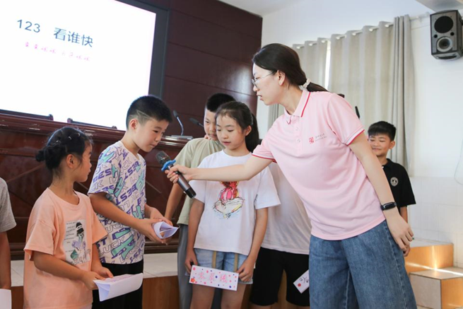 实践队队员带领学生们进行了“夏日游园会”开班活动。全体学生在队员们的带领下制作姓名牌,分组参与了“123,看谁快”“一样不一样”“逛三园”等趣味游戏,参与者全情投入,现场气氛活跃,距离迅速拉近,为后续课程的顺利开展奠定了基础。