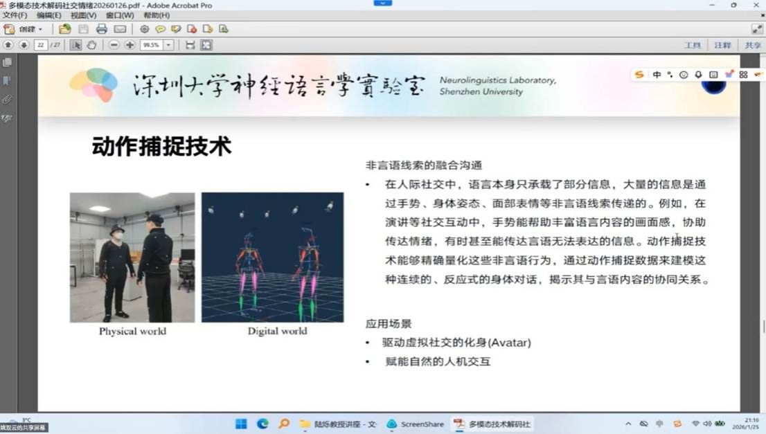 2026年1月25日,深圳大学神经语言学实验中心主任陆烁教授应邀来中心访问,并作了题为《多模态技术解码社交情绪》的学术讲座。讲座由中心副主任姚双云教授主持,线上及线下师生数十人参加了本次讲座。