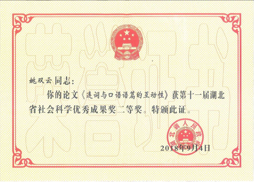 本中心姚双云教授的成果《连词与口语语篇的互动性》于近日荣获第十一届湖北省社会科学优秀成果二等奖。