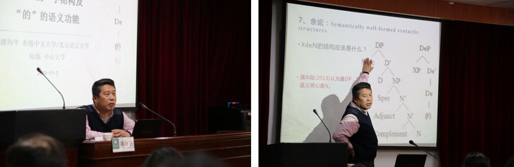 讲座伊始,潘教授先通过几个具体例子来说明“的”字结构的复杂性。比如,“张三的照片”这句话可以理解为三种意思,一是张三拍的照片,二是张三拥有的照片,三是张三在照片里。朱德熙先生曾根据“的”字充当句子成分的情况,把“的”字分为副词性后附成分“的1”、状态形容词后附成分“的2”和名词性后附成分“的3”。随后,潘教授介绍了自己的研究成果,认为普通话中de1、de2和de3应该合并为一个de,de3中引入论元的de单独一类为dea。从语义类型理论角度,结合对其他学者研究成果的思考,潘教授认为普通话定中结构和句尾“的”是谓词性成分标记,可以把de前成分变成<e,t>type, 或者标记整个“的”字结构为<e,t>type。此外,句尾de可能发生了向语气词功能的演化,这再次印证了de作为谓词性标记而非名词性标记的合理性。最后,潘教授还介绍了XdeN的结构问题。讲座结束后,在座师生积极向潘教授提问交流,现场气氛热烈。