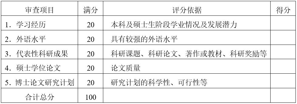 资格审核总分值为100分。资格审核小组根据申请人提供的材料,对其学术背景、学业成绩、外语水平、科研成果、获奖、同行专家推荐意见、毕业论文或开题报告、读博期间研究计划等材料进行量化并作出综合评价,确定最终入围综合考核的考生名单并对外公示。资格审核具体内容: