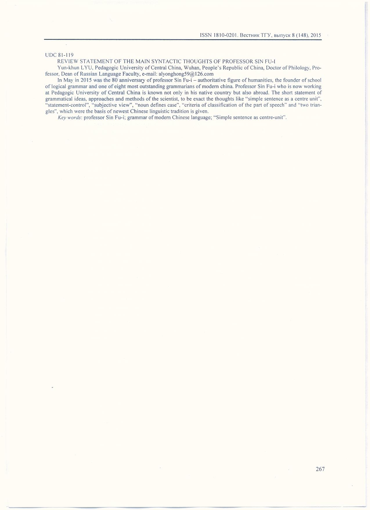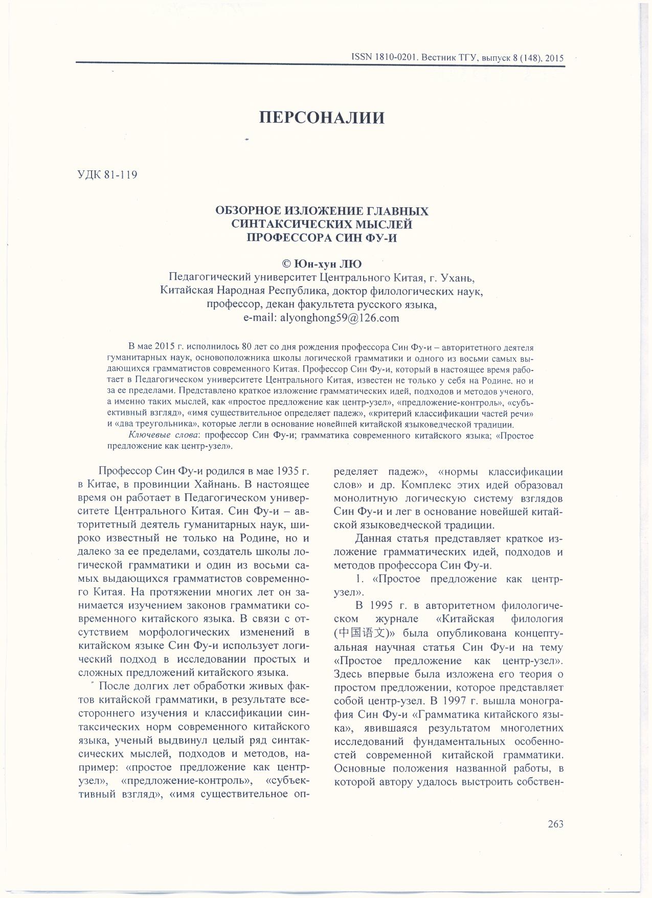 华中师大教授、俄语系主任、本中心兼职博导刘永红教授,在《俄罗斯国立塔波夫大学学报》2015年第8期的“人文科学卷”上,发表长文《邢福义句法思想述要》。《俄罗斯国立塔波夫大学学报》是俄罗斯教育部认定的核心期刊,在学界较有影响。