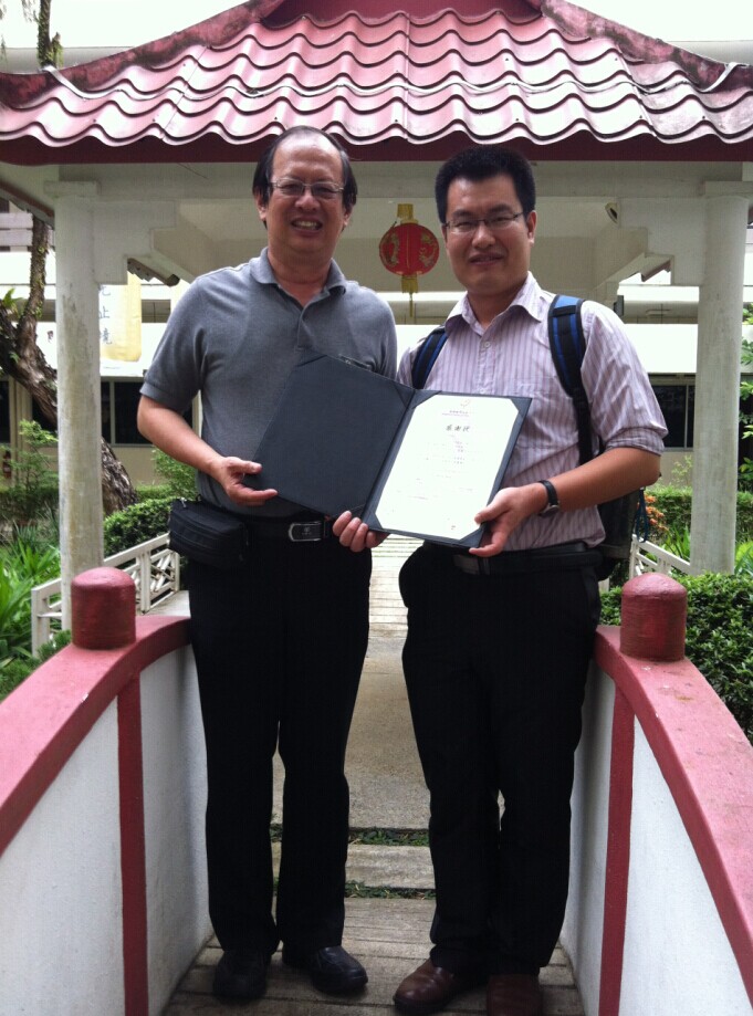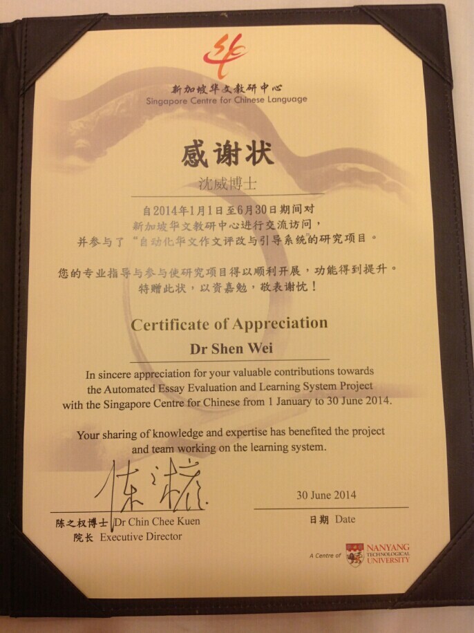 本中心青年教师沈威博士于2014年1月1日至6月30日应邀赴新加坡华文教研中心进行了交流访问。在此期间,他参加了该中心的新加坡教育部项目“自动化华文作文评改与引导系统”的研究工作,并参与了该中心主办的一系列学术活动。