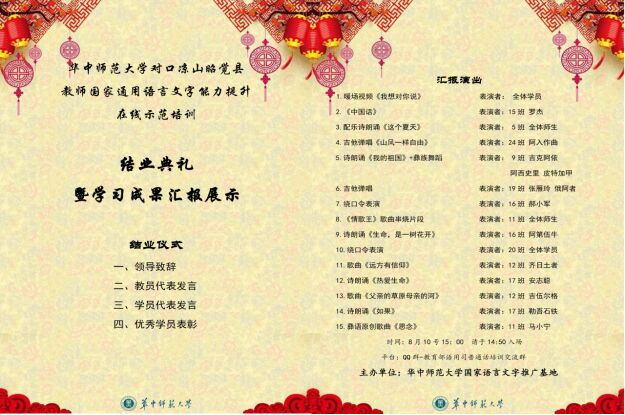 8月6日,教育部语用司组织的“52个未摘帽贫困县教师国家通用语言文字能力提升在线示范培训结业式”上,我校培训项目的1位教师和1位学员受邀参加并作为代表发言。
