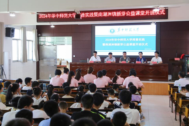 为普及国家通用语言文字,助力乡村振兴,7月22日,国家语言文字推广基地(华中师范大学)“推普助力乡村振兴”研究生实践队在湖南省岳阳市湘阴县南湖洲镇举行开班仪式。南湖洲镇人大主席李新颜、南湖四中校长刘海龙,实践队指导教师申定羽、肖辛格,百余名南湖洲镇中小学学生及家长出席本次活动。我校校友、南湖洲镇党委委员傅云涛主持开班仪式。