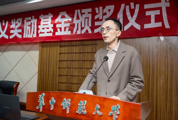 获奖教师代表刘彬分享了自己与邢先生跨越十余年的三段缘分。他谈到,从保研推荐到入职面试,再到博士后出站,邢先生的三次指引点亮了他的学术人生。他表示,作为桂子山年轻一代语言学人,深感重任在肩,定将继承先生遗志,守住初心,为把华师语言学科发扬光大贡献力量。