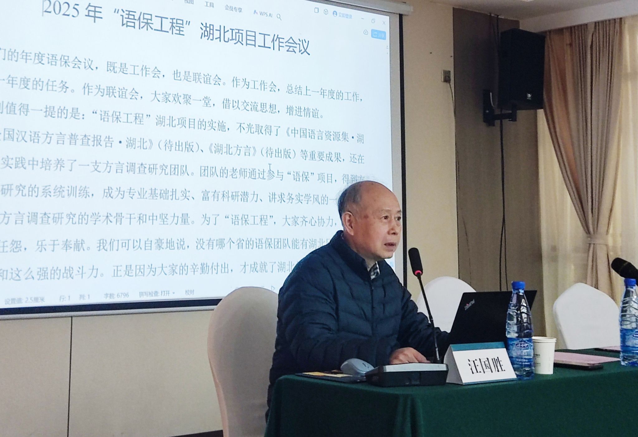 汪国胜教授对2024年湖北语保的各项工作做了全面总结,对2025年的工作任务进行了部署。2024年湖北项目团队出版了《中国语言资源集·湖北》和《湖北方言》,通过了“第一次全国汉语方言普查成果汇编·湖北”和“湖北口头文化的采录整理及数据库建设”专项的验收,启动了“湖北方言词典”项目。2025年将着重开展两项工作:一是“湖北口头文化的采录整理及数据库建设”项目的整改结项和成果打造;二是“湖北方言深度调查”项目的全面推进。他强调,保护和传承湖北方言,弘扬民族优秀文化,是历史赋予我们的光荣使命,希望团队成员本着替国家负责、替学术负责、替历史负责的态度,努力完成好项目任务。