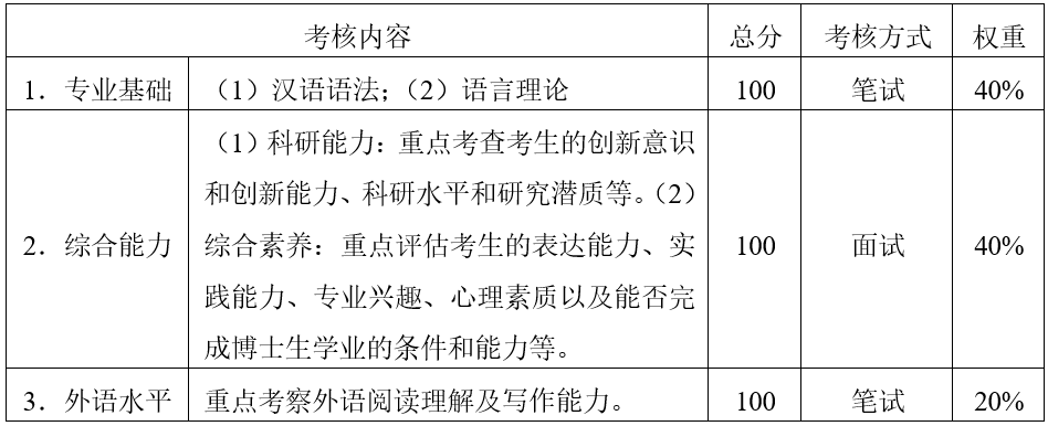 资格审核总分值为100分。资格审核小组根据申请人提供的材料,对其学术背景、学业成绩、外语水平、科研成果、获奖、同行专家推荐意见、毕业论文或开题报告、读博期间研究计划等材料进行量化并作出综合评价,确定最终入围综合考核的考生名单并对外公示。资格审核具体内容: