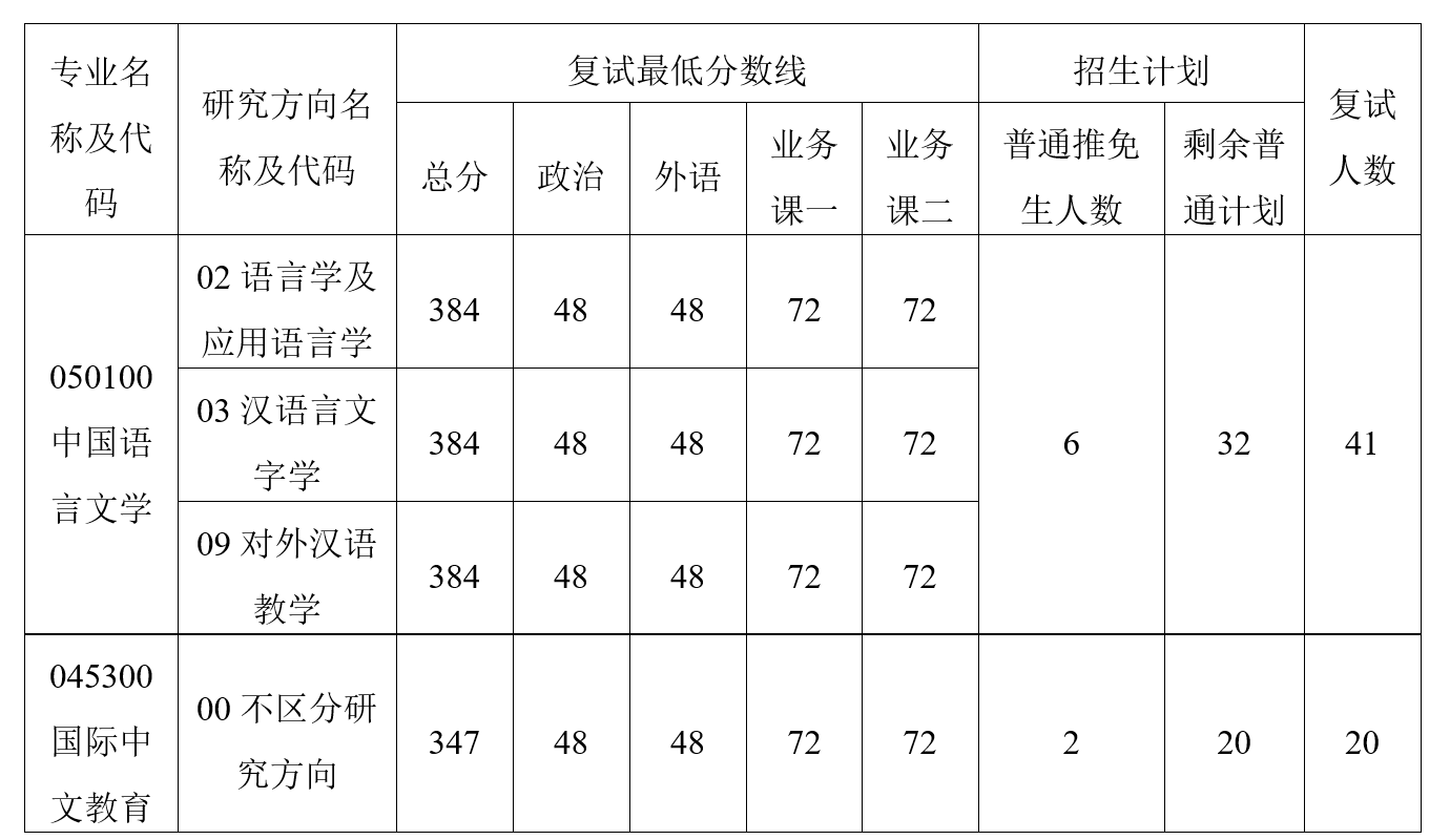 注:复试人数中不含“少数民族高层次骨干人才计划”考生,该类型考生由学校统筹,不占语言所招生计划,此表中复试人数未包含此类考生。