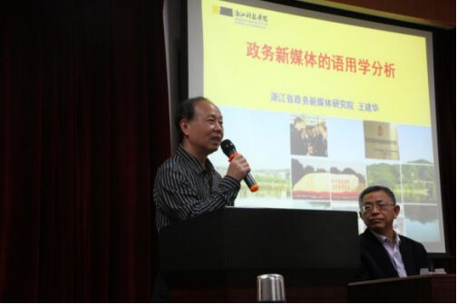 王建华教授长期从事现代汉语、语用学和语言文字规范化的研究。近年来,他关注到在新时代背景下应运而生的“政务新媒体”,并用语用学相关理论对其加以研究。他首先介绍了“政务新媒体”的概念、范围及其研究价值和意义。接着,王教授分别从微观语用学和系统语用学的角度出发,结合大量的真实语例,如 “十九大”报告、天津港“8·12”爆炸事故等,深入浅出地分析了政务新媒体语言的语用特点以及区别于传统媒体的三大标志性特征——复杂活泛的语境、多模态的话语和能动的语用主体。最后,王教授从正反两个方面举例说明政务新媒体语言应用的巧妙之处和需要注意的问题,讲座内容详实而生动。