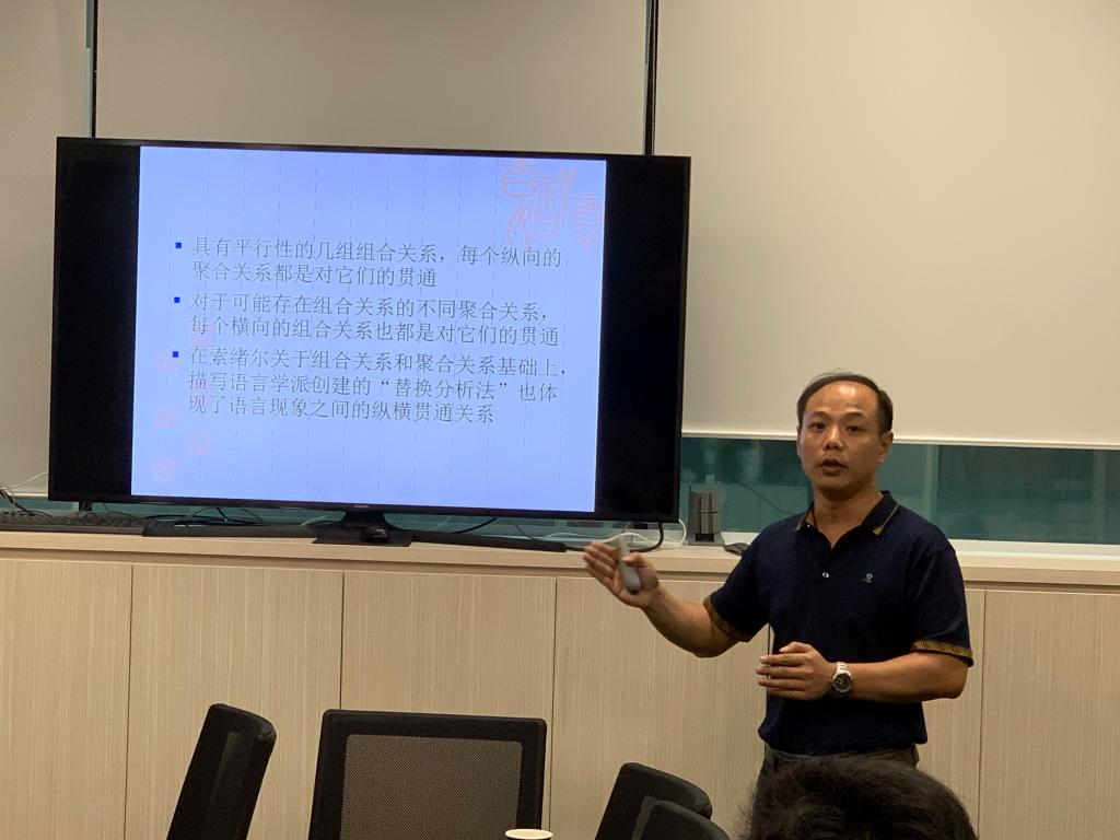 • 2019年8月13日,本中心副主任匡鹏飞教授应邀访问了新加坡国立大学,与该校中文系副主任谭晓薇等老师进行了座谈交流,并为师生作了一场题为《汉语中的纵横贯通现象及在研究中的应用》的学术报告,报告由彭睿副教授主持。匡教授指出,汉语和汉字中,存在大量纵横贯通现象,可分为单层贯通和立体式贯通两大类,纵横贯通既是一种语言现象之间的关系,也是一种语言研究的思路和方法,在语言学理论与方法论中具有一定价值,值得引起重视。报告之后,匡教授又与师生们就有关内容进行了讨论,并逐一回答了各位博士生提出的问题。