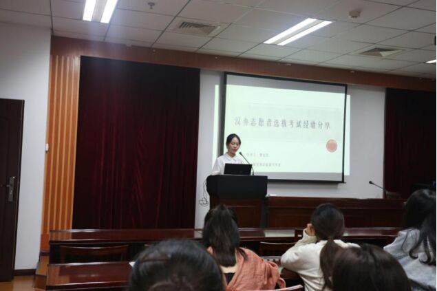 最后一位上台交流的是2019级学硕的鲁家文学姐,她主要分享了汉办志愿者选拔考试的经验。学姐从如何选择院校、如何准备考试开始介绍,为大家讲解了许多笔试和面试的题型与答题技巧,她还分享了自己上课时出现过的突发状况及应对方式,给同学们传授了许多宝贵经验。