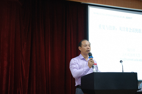 2023年5月17日上午,洛杉矶加州大学亚洲语言文化系教授、中文部主任陶红印先生应本中心邀请,为师生们作了一场题为《重复与创新:从日常会话到语言哲学的思考》的学术报告。报告由中心副主任匡鹏飞教授主持,共有50余位师生参加了此次活动。