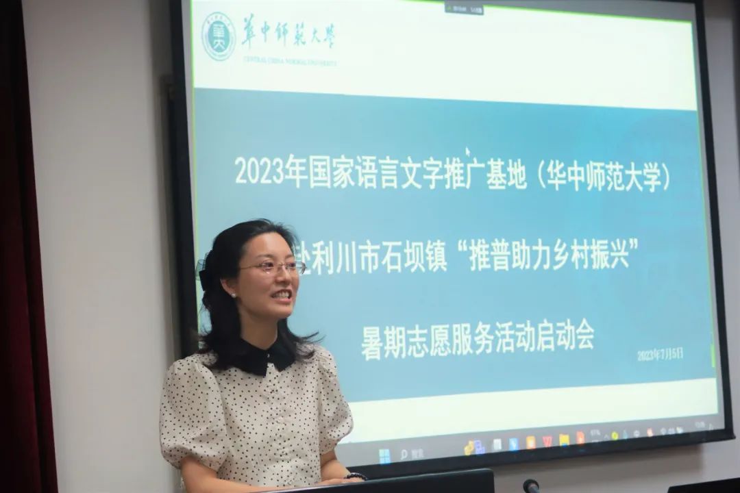 2023年7月5日下午,国家语言文字推广基地(华中师范大学)赴利川市石坝镇“推普助力乡村振兴”暑期志愿服务活动启动会在语言研究所报告厅举行。