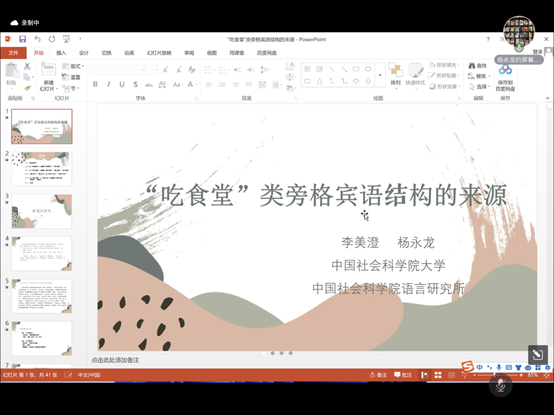 2023年11月20日晚,中国社会科学院语言研究所二级教授、历史语言学研究二室主任、中国社会科学院大学特聘教授、博士生导师杨永龙先生应华中师范大学文学院的邀请,在桂子山人文论坛,线上做了题为《“吃食堂”类旁格宾语结构的来源》的学术讲座。讲座由文学院张邱林教授主持,来自文学院、语言所的40余名师生参加了此次学术讲座。