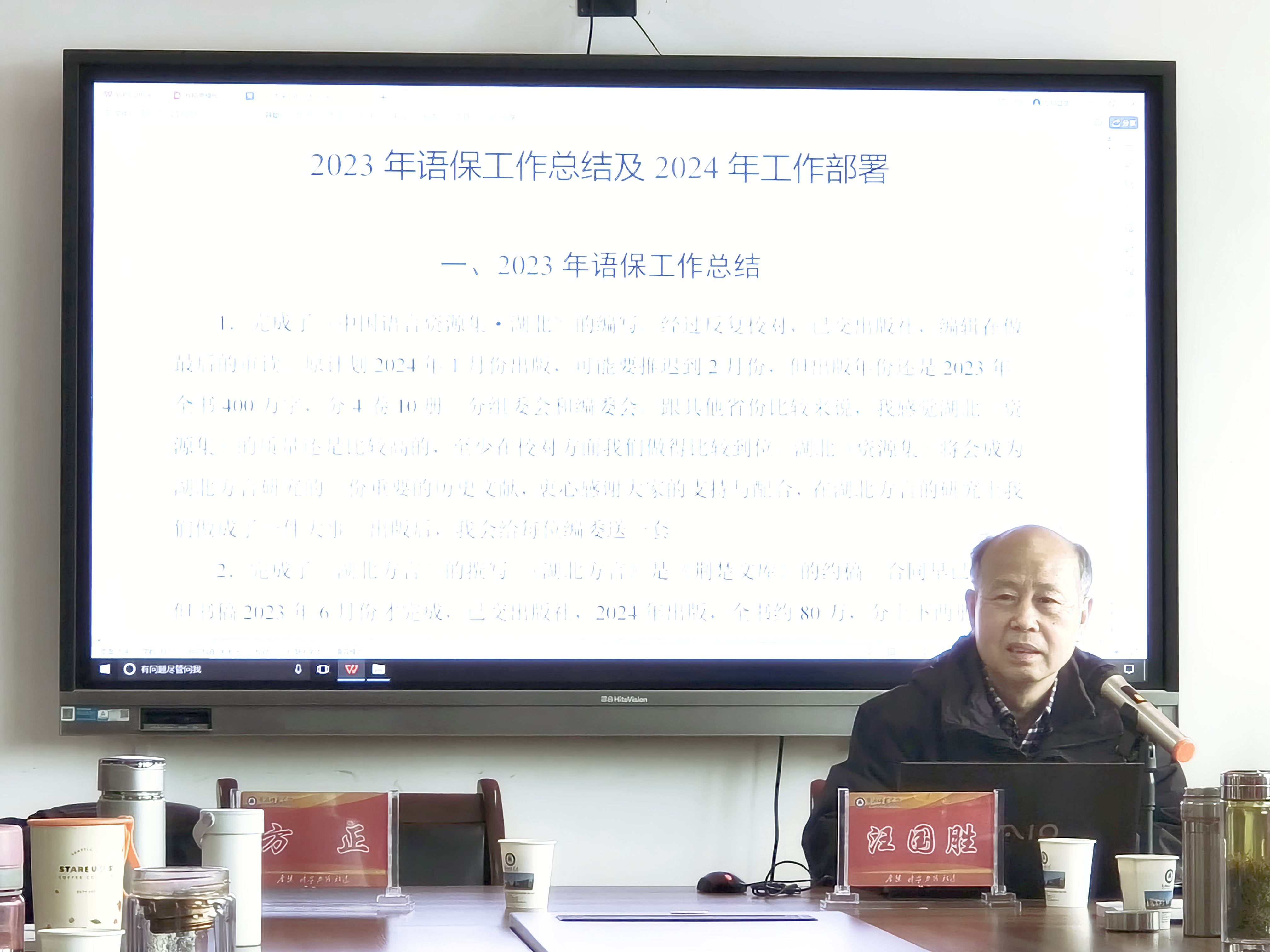 汪国胜教授对2023年语保工作作了全面总结,对2024年工作进行了部署。2023年完成了《中国语言资源集·湖北》的编写、《湖北方言》的撰写,完成了“第一次汉语方言普查成果汇编·湖北”专项,整理出版了赵元任等《湖北方言调查报告》,推进了“湖北口头文化的采录整理与数据库建设”专项、“湖北方言的深度调查”项目等。2024年的重点工作是继续推进“湖北方言的深度调查”项目,完成“湖北口头文化的采录整理与数据库建设”专项等。