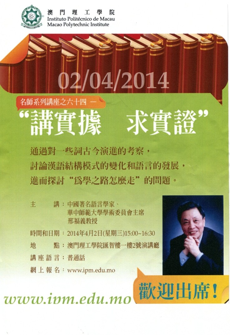 • 邢福义先生同时接受澳门大学和澳门理工学院这两所澳门著名大学的邀请,由我陪同,于2014年3月31日至4月3日到澳门访问与讲学。